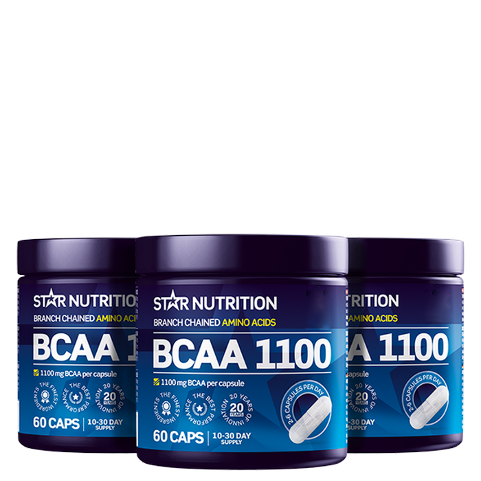 3 x BCAA 1100 – Star Nutritionin korkeapitoiset BCAA-kapselit. Päivittäinen annos antaa 2200–6600 mg haaraketjuisia aminohappoja vapaassa muodossa.