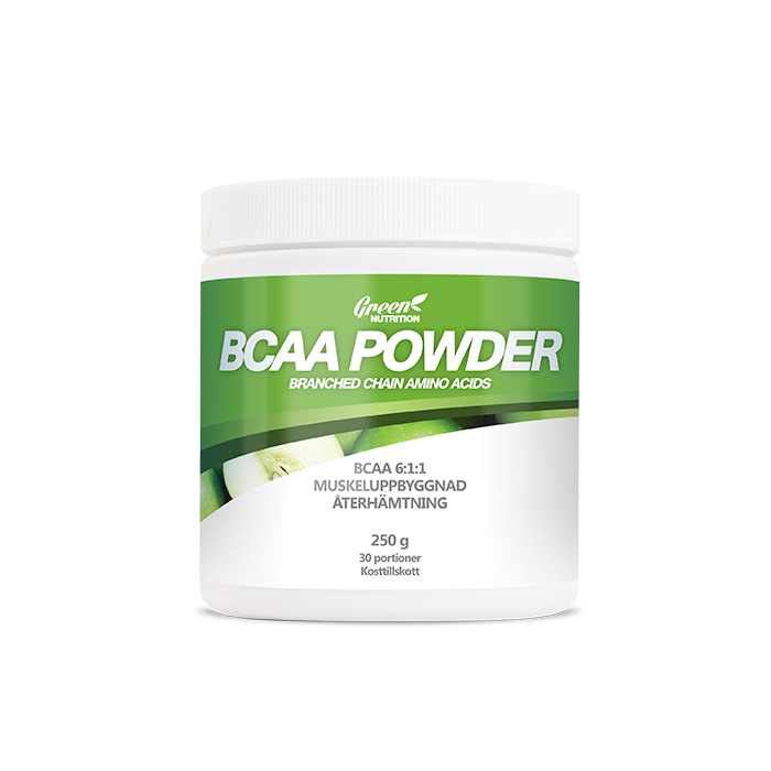 BCAA Powder från Green Nutrition är naturlig BCAA från majs och är smaksatt med steviaglykosider i den fräscha smaken Äpple.