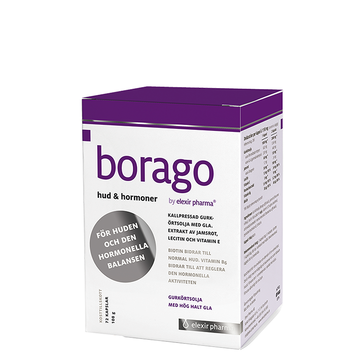 Borago med Biotin som bidrar till normal hud och vitamin B6 som reglerar den hormonella aktiviteten. Innehåller gurkörtsolja med GLA, lecithin, jamsrot och vitamin E