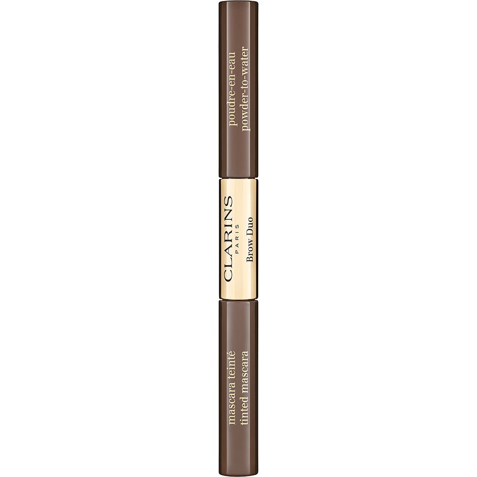 10 g, Clarins Brow Duo on kaksipäinen kulmatuote kulmien muotoiluun ja kiinnitykseen. Kulmatuotteessa yhdistyy kaksi ominaisuutta, tussimainen kynä kulmien värjäämiseen ja vahvistamiseen sekä kulmaharja kulmien muotoiluun ja kiinnittämiseen. Kynäosan vesipohjainen puuterikoostumus muuntautuu voidemaiseksi kulmiin levitettäessä. Harjaosan sisältämä geelimäinen, väriä antava maskarakoostumus kiinnittää kulmakarvat muotoonsa. Lopputuloksena on luonnollisen tuuheat, siististi muotoillut kulmat. Kulmatuotteesta on saatavilla viisi eri pitkäkestoista sävyä, jotka kestävät kulmissa siisteinä jopa 12 tuntia.