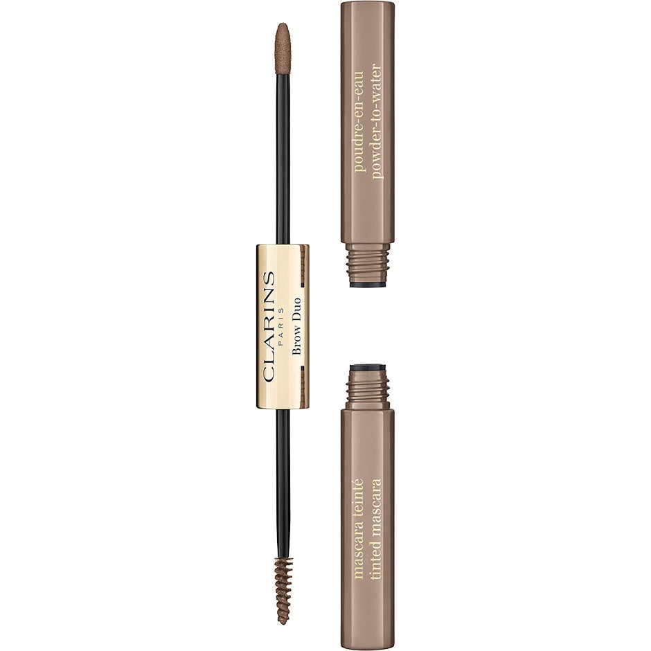 10 g, Clarins Brow Duo on kaksipäinen kulmatuote kulmien muotoiluun ja kiinnitykseen. Kulmatuotteessa yhdistyy kaksi ominaisuutta, tussimainen kynä kulmien värjäämiseen ja vahvistamiseen sekä kulmaharja kulmien muotoiluun ja kiinnittämiseen. Kynäosan vesipohjainen puuterikoostumus muuntautuu voidemaiseksi kulmiin levitettäessä. Harjaosan sisältämä geelimäinen, väriä antava maskarakoostumus kiinnittää kulmakarvat muotoonsa. Lopputuloksena on luonnollisen tuuheat, siististi muotoillut kulmat. Kulmatuotteesta on saatavilla viisi eri pitkäkestoista sävyä, jotka kestävät kulmissa siisteinä jopa 12 tuntia.
