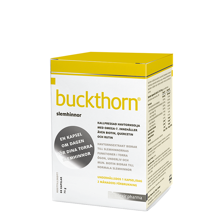 Buckthorn är ett kosttillskott från Elexir Pharma med havtornsextrakt som innehåller omega-3, 6,7 och 9. Innehåller även biotin som bidrar till underhåll av normala slemhinnor.