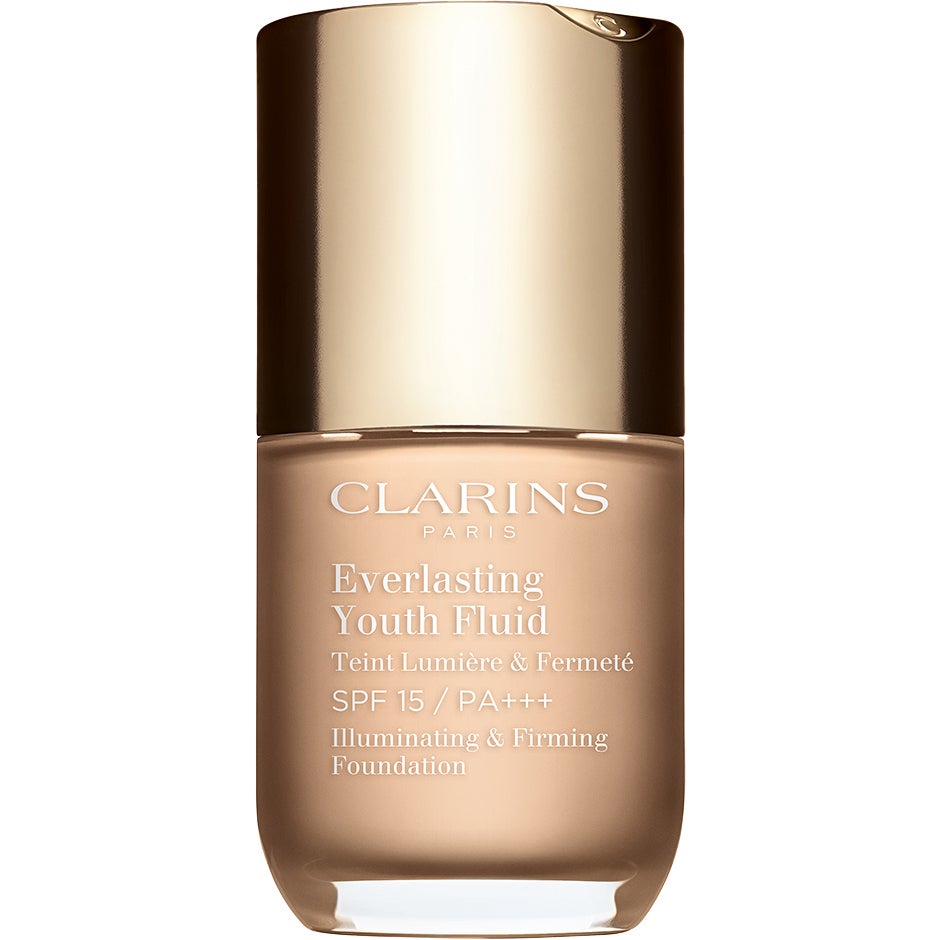 30 ml, Clarins Everlasting Youth Fluid -meikkivoide yhdistää ihonhoidon ja meikkipohjan yhdeksi, kauniin kuultavaksi tuotteeksi. Puolipeittävä meikkivoide asettuu iholle valoa heijastavana, tasaisen pehmeänä kerroksena ja häivyttyy helposti. Ikääntyvälle iholle erityisen sopiva meikkivoide häivyttää näkyvistä juonteita ja siinä on erityisen kestävä koostumus. Clarins Everlasting Youth Fluid -meikkivoiteen sisältämät kasviuutteet kuten sikuri, punainen jania-levä ja kauran luontaiset sokerit tuovat iholle hienoisen, kohottavan efektin ja hoitavat ihoa korostaen sen nuorekkuutta. Satiinisen pinnan jättävä meikkivoide sisältää kevyen SPF 15 -aurinkosuojan, joka torjuu sekä UVA- että UVB-säteitä (PA+++). Kuulas meikkivoide Häivyttää juonteita Heleä ja puolipeittävä lopputulos Hoitava vaikutus