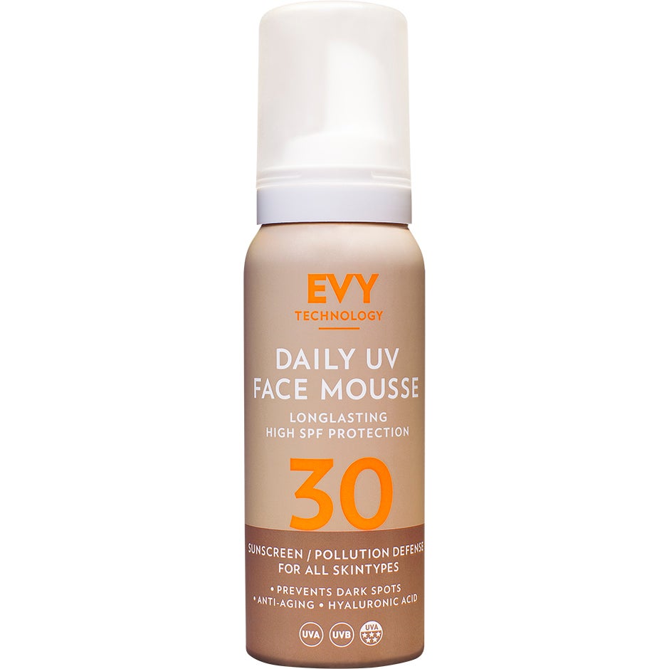75 ml, EVY Daily Face Mousse SPF30 -aurinkovaahto tuo kasvojen iholle suojaa auringon UV-säteilyltä. Päivittäiseen käyttöön sopiva aurinkovaahto auttaa vahvistamaan ihon suojautumiskyä ja ehkäisemään ikääntymisen merkkejä. Aurinkovaahdon kevyt koostumus ei tuki ihohuokosia ja sopii erinomaisesti käytettäväksi meikin alla. Tuotetta voidaan käyttää tavallisen kosteusvoiteen päällä. Aurinkovaahto sisältää mm. synergiassa toimivia C- ja E-vitamiineja, hyaluronihappoa, kollageenia ja muita ihoa hoitavia ainesosia, jotka yhdessä edistyksellisen teknologian kanssa tukevat ihon hyvinvointia ja ehkäisevät vapaiden radikaalien haitallisia vaikutuksia. Kasvoja auringon UV-säteilyltä suojaava vaahtoKaikille ihotyypeille SPF 30 Anti-age-vaikutus Koko: 75 ml