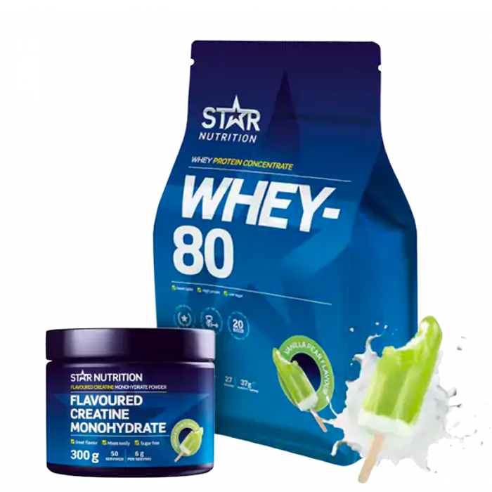 Salitreenaajan ”must have” tuottein varustettu Flavoured Starter Pack. Korkealaatuinen heraproteiinijauhe sekä mansikan tai vanilja-päärynän makuinen kreatiinimonohydraatti.
