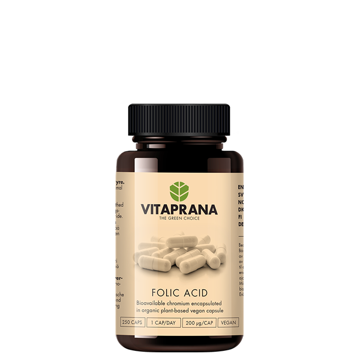 Vitaprana Folic acid innehåller 200µg (100% av Rekommenderad daglig dos) per kapsel.
