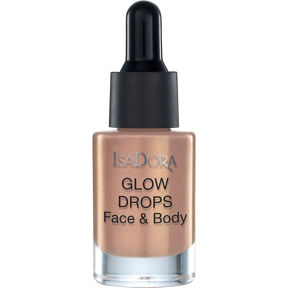 15 ml, IsaDora Glow Drops Face & Body Golden Edition -korostustipat tuovat heleyttä mihin tahansa meikkiin. Sekä kasvoille että vartalolle sopivat hohtotipat voi sekoittaa kosteusvoiteeseen, meikkivoiteeseen tai levittää suoraan meikin päälle tuomaan ekstra-heleyttä. Kaunis, hienojakoinen korostus tuo esille kasvojen parhaita puolia ja raikastaa ihoa hetkessä. Nestemäiset hohtotipat Voi sekoittaa meikkivoiteeseen tai kasvovoiteeseen Sekä kasvoille että vartalolle