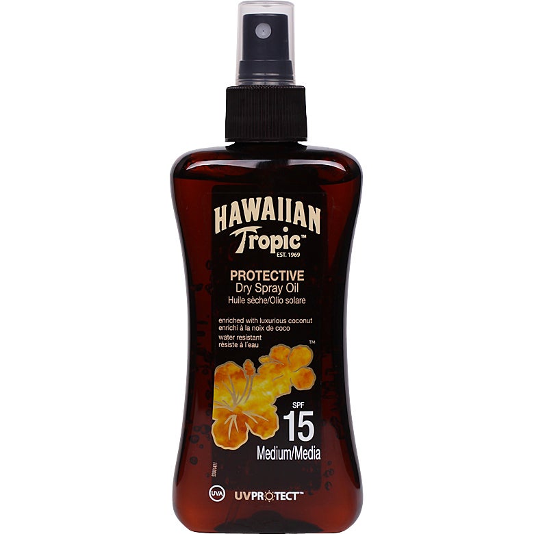 200 ml, Ruskettumista edesauttava kuivaöljysuihke, jonka huumaavan trooppisessa koostumuksessa tuoksuvat mango, papaija, kukui- ja passionhedelmä. Pullo täynnä aurinkoisen kesän tuoksua! Hawaiian Tropic Protective Dry Spray Oil SPF 15 sopii iholle, joka kaipaa sekä suojaa auringolta että ihoa pehmentävää kosteutusta. Imeytyy nopeasti.SPF 15 Vedenkestävä koostumus Koko: 200ml