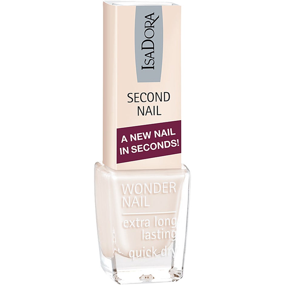 6 ml, Uusi kynsi sekunneissa – pelastus ohuille, pehmeille ja heikoille kynsille! IsaDora Wonder Nail Second Nail, Nude on kynsilakka, joka vahvistaa, tasoittaa ja kovettaa kynsiä. Leveä sivellin peittää koko kynnen ja mahdollistaa kynsilakan tasaisen levityksen. Tuotetta voidaan käyttää aluslakkana tai yksinään kiiltävänä, läpikuultavana kynsilakkana.Sisältää mm. kalsiumia, merestä peräisin olevia mineraaleja, E-vitamiinia, Omega-3 ja -6 -rasvahappoja, oliivinlehtiuutetta, argan-öljyä, ginko biloba –uutetta, punaista teetä ja auringonkukan siemenöljyä .Erittäin kiiltävä lopputulos.Hypoallergeeninen koostumus.Koko: 6 ml