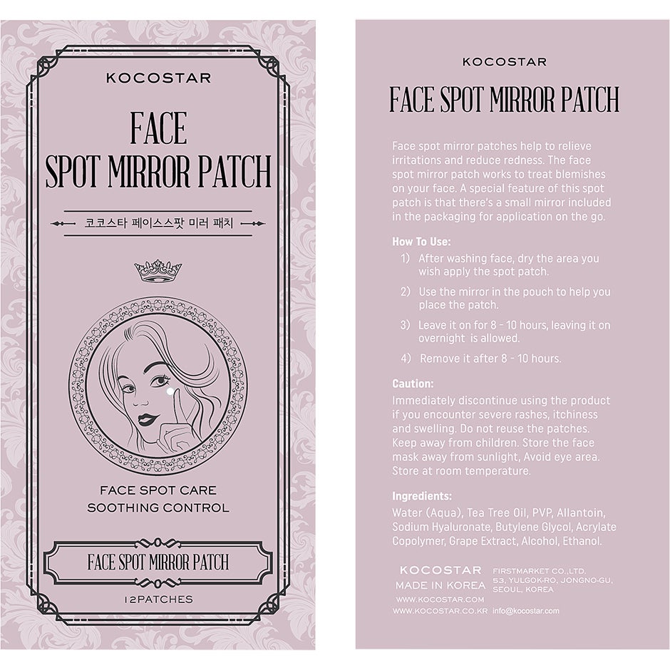 Kätevät KOCOSTAR Face Spot Mirror Patch -fnnitarrat auttavat hoitamaan näppylöitä, lievittämään ihoärsytystä ja vähentämään näppyjen punoitusta. Teepuuöljyä ja salisyylihappoa hyödyntävät finnilaput ovat iholla lähe huomaamattomia ja niiden päällä voi käyttää meikkiä. Kätevä pakkaus sisältää peilin, jonka avulla laput on helppoa asettaa paikoilleen yksittäisten finnien päälle. Täsmähoito epäpuhtauksille Pakkaus sisältää 36 finnitarraa (3 x 12 kpl).KäyttöAseta finnilappu puhdistetulle, kuivalle iholle hoidettavan näppylän päälle ja anna lapun vaikuttaa 8-10 tuntia. Valitse finnin päälle aina hieman hoidettavaa aluetta suurempi lappu.