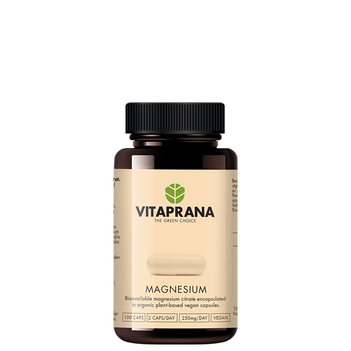 Vitaprana Magnesium ligger i veganska ekologiska kapslar som innehåller magnesium från en organisk källa och har mycket god biotillgänglighet. Magnesium bidrar bland annat till att minska trötthet och utmattning.
