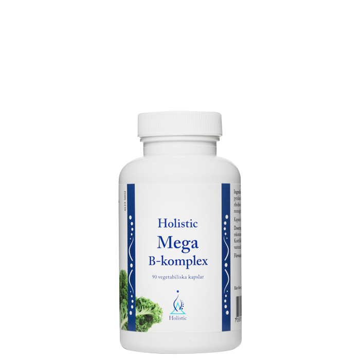 Holistics Mega B-komplex innehåller en kombination B-vitaminer som tillsammans bl. a. bidrar till en normal energiomsättning samt att minska trötthet och utmattning.