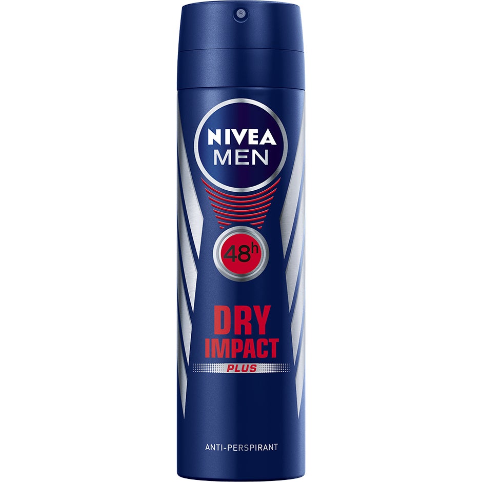 150 ml, Dry Impact on deospray miehille Nivealta, joka antaa tehokkaan 48 tunnin suojan. DryPlus System sekä luonnolliset mineraalit pitävät ihon raikkaana ja kuivana pitkään. Tasapainoinen koostumus ei sisällä alkoholia tai väriaineita luoden optimaalisen kokonaisuuden hellää ihonhoitoa sekä on luotettava antiperspirantti. Tuoksu on raikas ja klassinen Nivea-tuoksu.