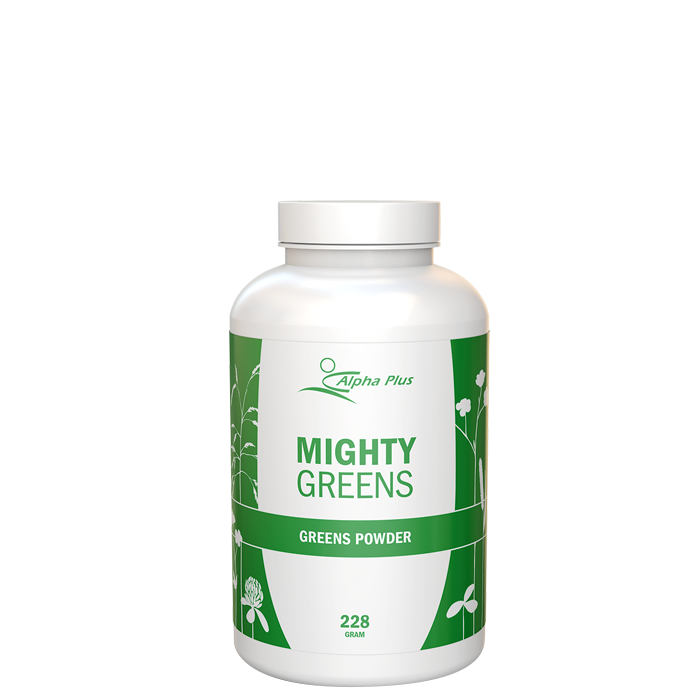 Mighty Greens från Alpha Plus innehåller en blandning av korngräs, alfalfa, vetegräs, havregräs och råggräs, samt de välkända algerna spirulina, chlorella och dulse.