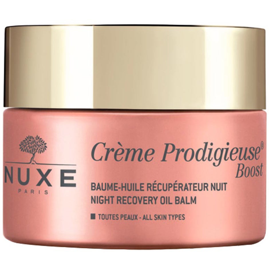 50 ml, NUXE Créme Prodigieuse Boost Night Recovery Oil Balm on yövoide, joka auttaa ihoa yön aikana palautumaan ulkoisilta rasituksilta, kuten stressiltä, väsymykseltä ja saasteilta ilman että se häiritsee ihon normaalia tasapainoa. Tämä yövoide sisältää antioksidanttikompleksin jasmiininkukalla, joka suojaa ihoa ulkoisilta rasituksilta. Sisältää myös macadamiaöljyä, joka antaa iholle miellyttävän pehmeän tunteen ilman että iho jää öljyiseksi. Night Recovery Oil Balm täyttää ihon energialla, piristää ja rauhoittaa ihoa. Herätessäsi ihosi on raikas, levännyt ja täynnä upeaa hehkua. Sopii kaikille ihotyypeille. Vaikuttaa nukkuessasi. Piristää, antaa energiaa ja hehkua. Kosteuttaa Sisältö 50 ml