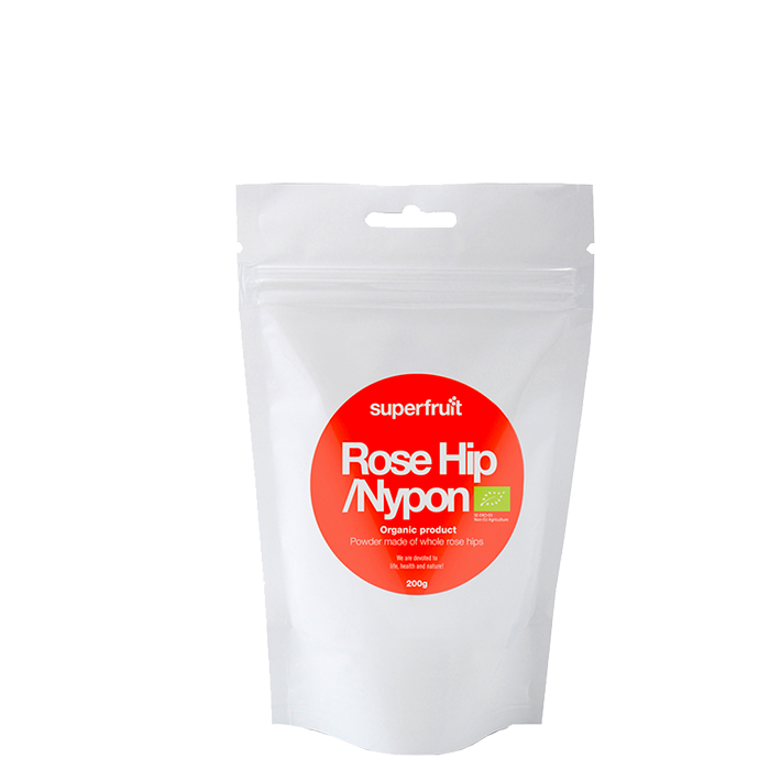 Nyponpulver EKO från Superfruit är ett ekologiskt pulver tillverkat av hela nypon där både skal och frön tagits tillvara.
