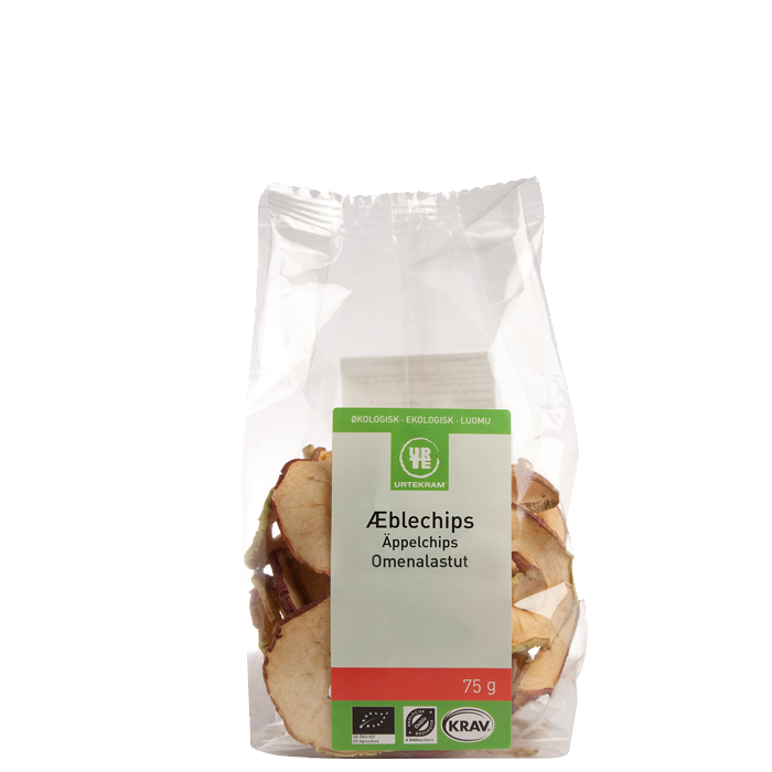 Chips Äpple från Urtekram är spröda ekologiska äppelringar som har torkats. Med en söt, smarrig smak och ett högt fiberinnehåll.