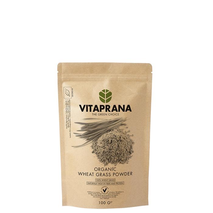 Ekologiskt vetegräs i pulverform från Vitaprana. Organic Wheat Grass Powder ger en koncentrerad näringsboost och mättar bra.