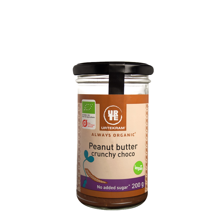 Jordnötssmör Crunch Chocolate från Urtekram är ett gourmetjordnötssmör med tillsatta knapriga kakaobitar och vanilj. Kakaons råa sötma passar fint i bakning.
