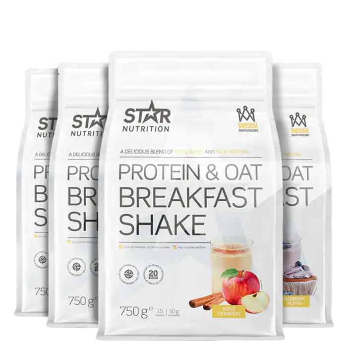 4 x Protein & Oat Breakfast Shake, 750 g – Star Nutritionin helposti sekoitettava jauheseos, joka sisältää hitaita hiilihydraatteja, täyttäviä kuituja ja laadukasta maitoproteiinia.