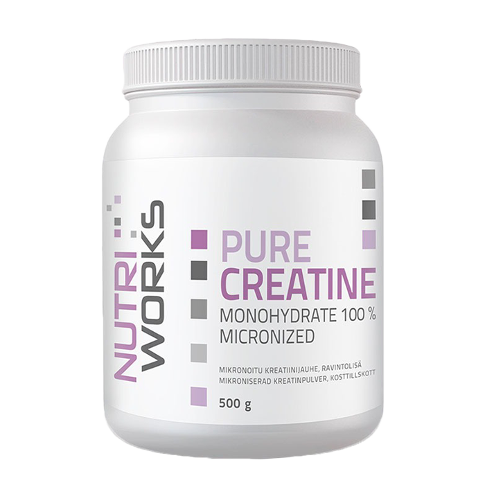 Nutri Works Pure Creatine Monohydrate 100 % on puhdas maustamaton kreatiinimonohydraattijauhe.