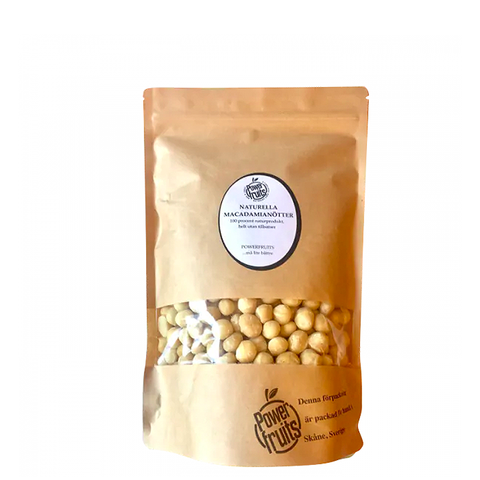 Naturella, raw macadamianötter från Powerfruit. Macadamianöten är mest känd för sin mjuka krämiga smak men också för sitt innehåll av enkel- och fleromättade fetter.