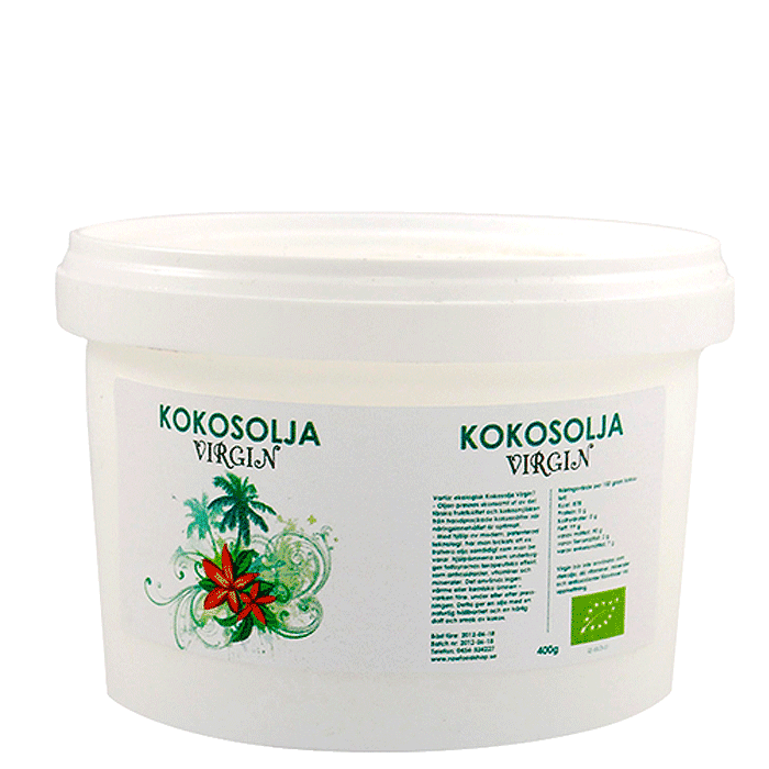 Ekologisk kokosolja (virgin) från Rawfoodshops som är helt fri från transfetter! Innehåller laurinsyra som hjälper till att bygga upp immunförsvaret!