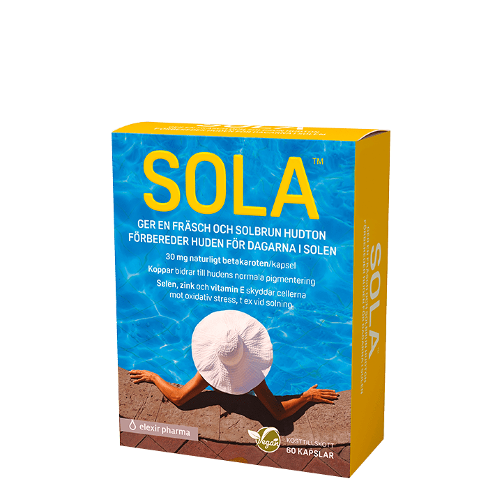 SOLA är ett kosttillskott från Elexir Pharma med betakaroten samt vitaminer och mineraler så som koppar som bidrar till hudens normala pigmentering.