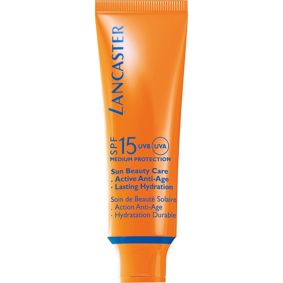 50 ml, Lancaster Sun Beauty Care Active Anti-Age SPF 15 50 ml on kevyt aurinkovoide kasvoille. Tämä tuote ylläpitää ihon kimmoisuutta ja joustavuutta samalla kosteuttaen sitä ja pidentäen rusketuksen kestoa. Levitä iholle ennen auringolle altistumista, ja lisää jokaisen uintikerran jälkeen.