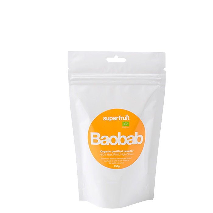 Baobabpulver EKO från Superfruit innehåller enbart ekologiskt pulver från baobabträdets frukt.