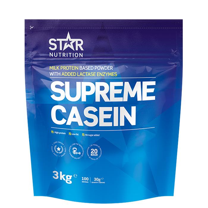 Supreme Casein, 3 kg – Tasaisen aminohappovirran antavaa, erittäin korkealaatuista ja hyvänmakuista kaseiiniproteiinia Star Nutritionilta. Kokonaiset 80% täysiarvoista proteiinia!