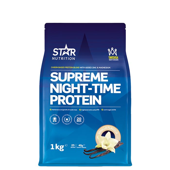 Supreme Night Time Protein från Star Nutrition är ett proteinpulver gjort särskilt för intag innan sänggående, med zink och magnesium som bidrar till normal proteinsyntes.