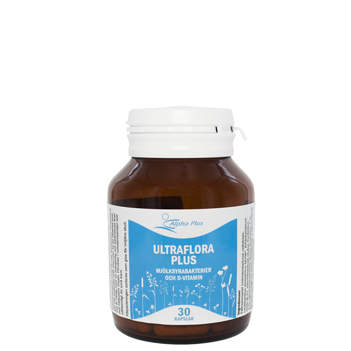 Ultra Flora Plus är ett kosttillskott från Alpha Plus som kombinerar mjölksyrabakterier i form av Lactobacillus acidophilus NCFM® och Bifidobacterium lactis Bi-07® med vitamin D3, björnbärsextrakt och björnbärsbladextrakt.